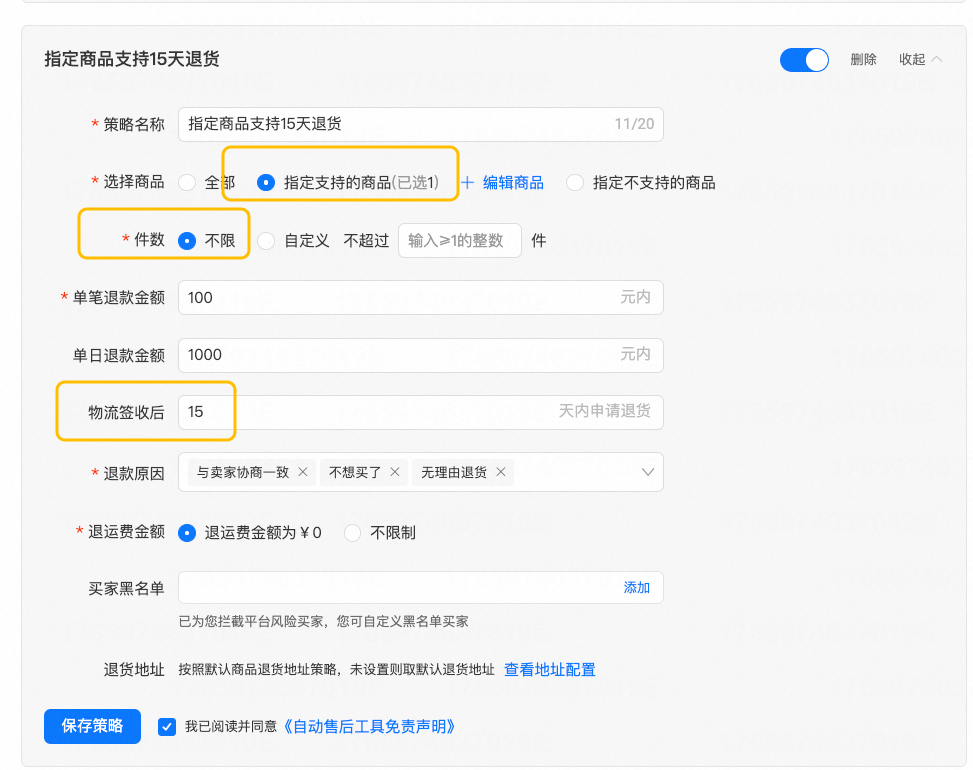 - 控制风险:限制退货件数、设置签收后X天内才可退