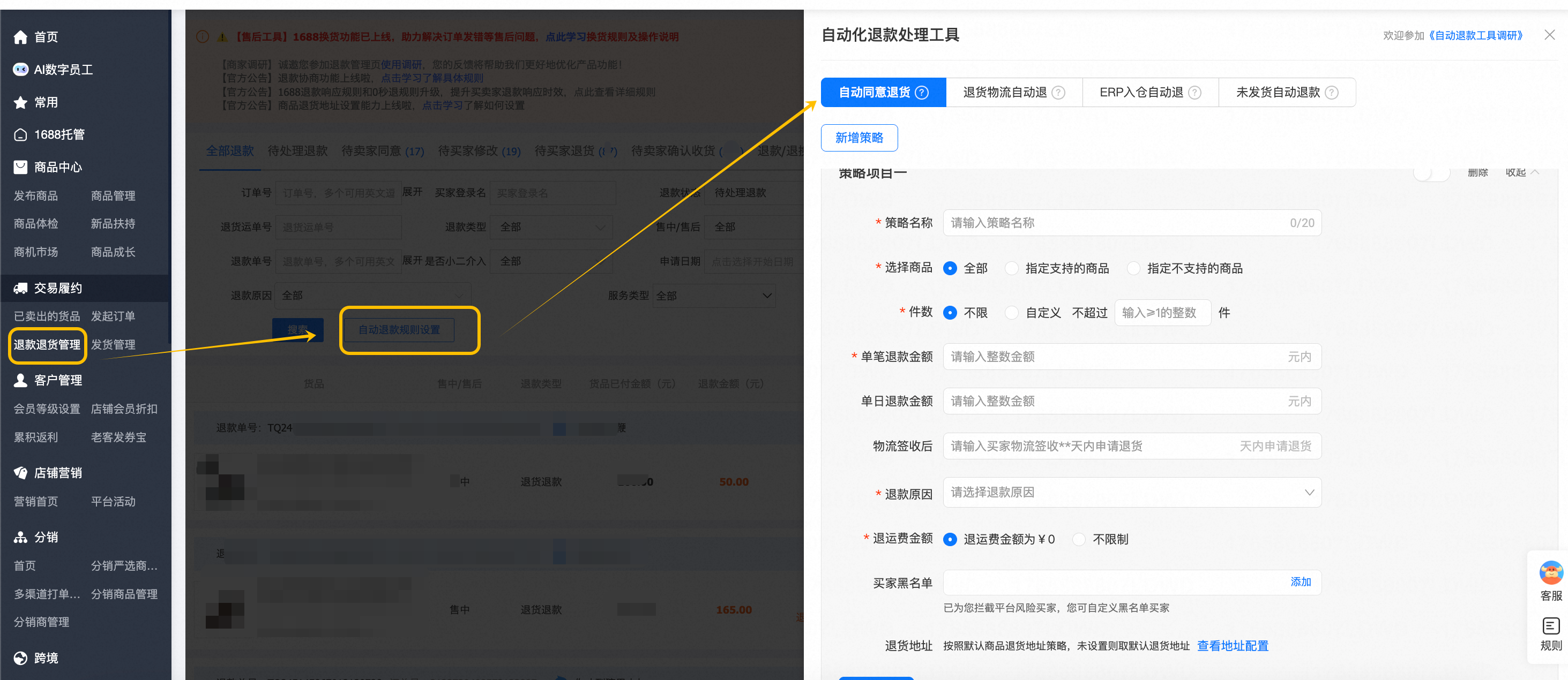 - 登录【商家后台】→【退货退款管理】→【自动退款工具设置】